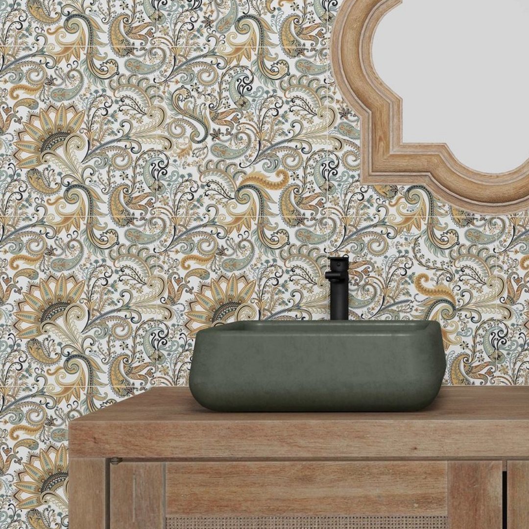 The Boteh collection is a feature packed wall and floor tile. These intricate paisley influenced designs can easily transform a space into a mesmerizing oasis. The beauty of these tiles lies in their intricate patterns and meticulous detailing, each one carefully crafted to create a stunning masterpiece.